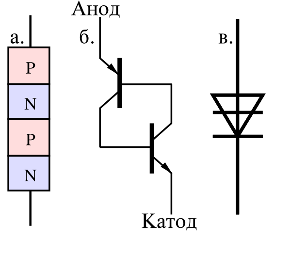 Функционирует как тиристор, но нe имеет управляющего электрода, включение в проводящее состояние происходит при превышении прямого напряжения на приборе свыше напряжения отпирания.