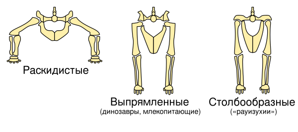 Задние конечности динозавров, как у большинства современных млекопитающих, выпрямлены, но отличаются от таких у большинства других рептилий, чьи конечности растягиваются по обе стороны[55]. Это положение обусловлено развитием углубления в области таза, обращённого вбок (обычно открытого углубления и соответствующей обращённой внутрь головки на бедре[9]). Их вертикальное положение позволяло ранним динозаврам легко дышать во время движения, что, вероятно, способствовало выносливости и уровням активности, которые превышали таковые у «ползучих» пресмыкающихся[56]. Вертикальные конечности, вероятно, также помогали поддержать развитие большого размера, уменьшая изгибающие напряжения на конечностях. У некоторых не относящихся к динозаврам архозавров, включая равизухий, также были прямые конечности, но это было достигнуто с помощью конфигурации тазобедренного сустава, в которой вместо выступа бедренной вставки на углублении на бедре, верхняя тазовая кость поворачивалась, формируя нависающий выступ[57].