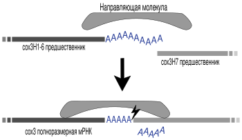 Кроме того, экспрессия митохондриальных генов динофлагеллят также характеризуется необычными особенностями. Белоккодирующие гены мтДНК лишены стандартных старт-кодонов AUG, более того, динофлагелляты не используют и обычные стоп-кодоны. Транскрипты cox1 и cob полностью лишены стоп-кодонов, в транскриптах cox3 стоп-кодон UAA всё же имеется, однако он не транскрибируется с ДНК, а образуется путём олигоаденилирования U, расположенного на конце исходного транскрипта и входящего в состав последней рамки считывания. У динофлагелляты Karlodinium micrum процессинг транскриптов cox3 включает транс-сплайсинг мРНК — процесс, при котором кодируемые независимо транскрипты-предшественники cox3 соединяются вместе, давая зрелый транскрипт. Транс-сплайсинг cox3 был описан и у других динофлагеллят[52].