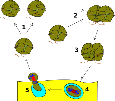 Для митоза динофлагеллят характерен ряд особенностей: ядерная мембрана сохраняется (закрытый митоз), не формируется метафазная пластинка. Такой тип закрытого митоза получил название диномитоз[47]. В качестве примера наиболее продвинутого типа митоза у динофлагеллят можно рассмотреть митоз Syndinium. Начало деления знаменуется удвоением оснований жгутиков с двух до четырёх. В течение этой стадии ядро увеличивается в размерах и можно разглядеть много Y- и V-образных хромосом. В профазе митоза происходит продольное расщепление хромосом и образуются хроматиды, спирально закрученные вокруг друг друга. Продолжительность профазы у динофлагеллят в значительной мере определяется длиной хромосом: чем хромосомы длиннее, тем больше времени занимает их раскручивание[48].