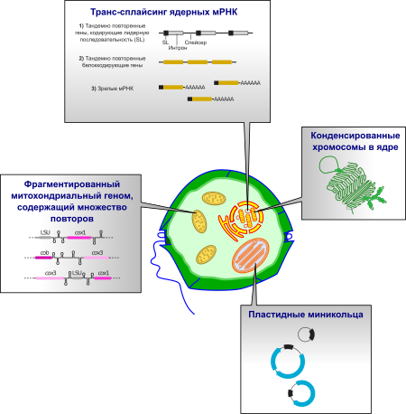 Другие типы пластид, появившиеся в результате эндосимбиозов с не-красными водорослями, были приобретены позже перидининсодержащих пластид, и их геномы имеют вид, обычный для пластидных геномов (единственная кольцевая молекула ДНК)[33].