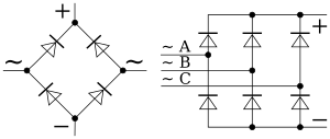 Рисунок 1. Электрические принципиальные схемы однофазного двухполупериодного моста Гретца (слева) и трёхфазного двухполупериодного выпрямителя Ларионова (справа), ~A, ~B, ~C — фазы трёхфазной питающей сети переменного тока. |