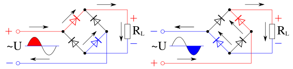 На вход () моста подаётся переменное напряжение, не обязательно синусоидальное. В одном из полупериодов (на рисунке 5 слева) открыты два диода в противоположных плечах моста и ток проходит только через эти 2 диода, а 2 других в другой паре противоположных плеч при этом заперты. На другом полупериоде (на рисунке 5 справа) открываются два других диода и другая пара диодов запирается. В нагрузке ток в обоих полупериодах течёт в одном направлении, — диодный мост преобразует переменный ток в пульсирующий постоянный[14].