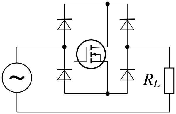 Другое применение — управление переменным напряжением с помощью активного элемента, не допускающего работы при другой полярности приложенного напряжения, например, полевого мощного транзистора с изолированным затвором (рисунок 11). В этой схеме активный прибор включен в диагональ «» — «» моста, а нагрузка, мост и источник переменного напряжения включены последовательно. Напряжение на управляющем приборе не изменяет полярность на обоих периодах переменного напряжения.