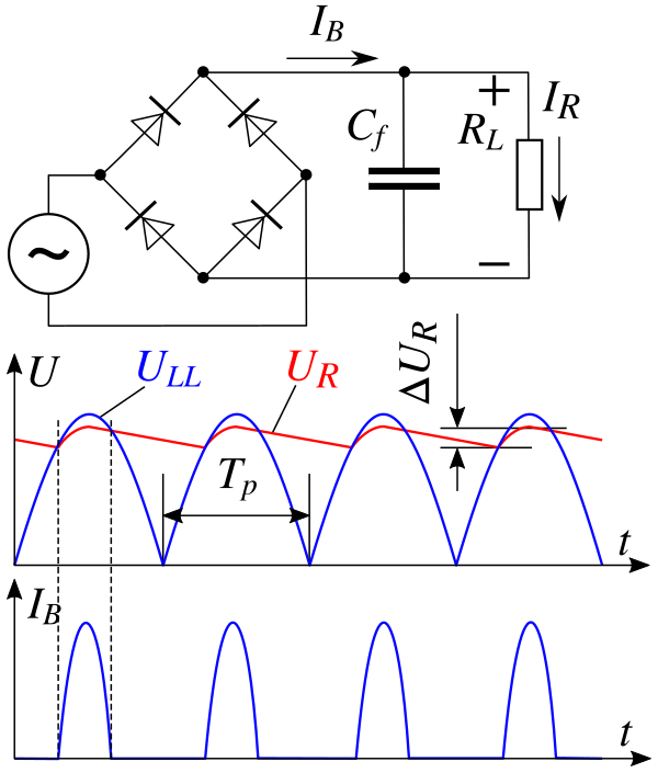 Для сглаживания пульсаций используются фильтры. Простейший фильтр — конденсатор, включённый параллельно нагрузке — потребителю постоянного тока (рисунок 10.). Конденсатор фильтра запасает энергию (заряжается) импульсами тока на вершинах импульсов пульсаций и отдаёт её в нагрузку при провалах выходного напряжения моста, вызванного пульсациями. Скорость разряда конденсатора с ёмкостью при токе нагрузки в провалах от пульсаций: