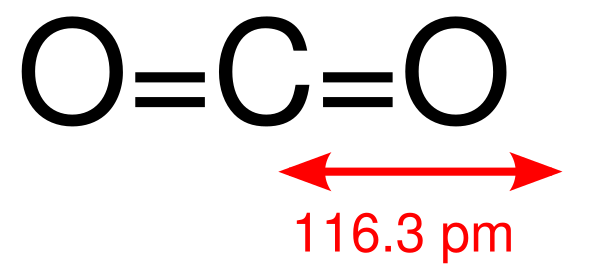 Молекула углекислого газа линейна, расстояние от центра центрального атома углерода до центров двух атомов кислорода 116,3 пм.