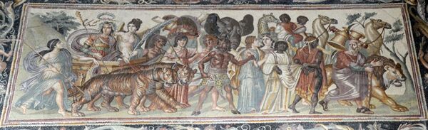 Отправился в поход против Индии[15] и вернулся через три года, поэтому ему приносят «трёхлетние жертвы» и совершают раз в 3 года вакхические празднества[16]. Первым навёл мост через Евфрат у города Зевгма, где хранился канат из лоз винограда и плюща[17]. О почитании Диониса в Индии рассказывал Мегасфен[18]. По некоторым данным, во время войны в Индии он был убит Персеем и погребён[19].