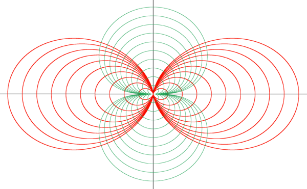 На рисунке справа (рассчитанном на компьютере) на плоскости, проходящей через ось диполя, показаны его силовые линии (красные), а также сечения эквипотенциальных поверхностей этой плоскостью (зеленые). Сам диполь находится в центре рисунка. Рисунок имеет две оси симметрии, горизонтальную и вертикальную, показанные прямыми линиями. Вертикальная прямая на рисунке является осью диполя. Силовые линии нарисованы красным цветом, они более вытянуты, расположены слева и справа от диполя, а линии зеленого цвета, более округлые, расположенные сверху и снизу диполя, суть сечения эквипотенциальных поверхностей («эквипотенциальные линии»). Координатные линии диполярной системы координат в трехмерном пространстве получаются вращением этого рисунка вокруг вертикальной оси.