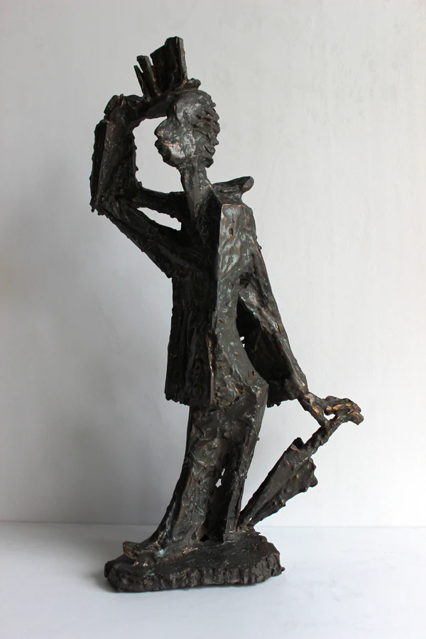 Скульптура представляет фигуру человека в полный рост. Мужчина опирается на левую ногу, в то время как правая нога выставлена далеко вперёд, к острому углу плинта. Правой рукой он держит цилиндрический головной убор, смещённый с головы. Левой рукой, отведённой назад, фигура придерживает зонт-трость, чей конец упирается в плинт у левой ноги. Голова имеет уплощённую форму, профиль характеризуется длинным носом, короткими усами и лысиной в передней части. Лицо обращено в сторону выставленной вперёд ноги. Образ дополнен свободной блузой с длинными рукавами и воротником, а также широкими брюками. Фигура деформирована и уплощена, в предплечье правой руки присутствует сквозное отверстие, имитирующее рельефную фактуру. Объект установлен на плинте в виде треугольника со скруглёнными углами. Размеры скульптуры составляют 40×20×15.