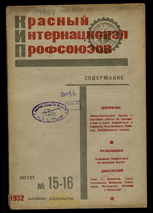 Красный интернационал профсоюзов: бюллетень Исполнительного бюро. — 1921, № 1 (август) — Г. 16 1936, № 14 (июль). -Москва : издание Красного интернационала профсоюзов, 1921—1936.