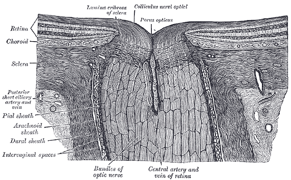 Аксоны ганглиозных клеток сетчатки образуют в месте выхода из глаза зрительный нерв, по которому сигналы от сетчатки передаются на следующие уровни обработки в зрительной системе. Обычно зрительный нерв состоит из 1-1,2 млн аксонов. Диск зрительного нерва является также точкой входа для крупных кровеносных сосудов, питающих сетчатку.[1]