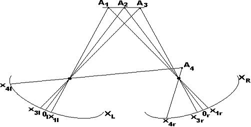 На рисунке изображена поверхность, заданная точками A1, A2, A3, которые находятся на одинаковом расстоянии от наблюдателя. На точку A2 (точку фиксации) направлен взгляд наблюдателя, поэтому она проецируется в fovea (центральную ямку) сетчаток его глаз (точки Ol, Or). Поверхности левой и правой сетчаток связаны с системами координат OlXL, OrXR таким образом, что центр fovea находится в точке 0. Пусть слева от точек Ol и Or лежит область отрицательных значений координат. Проекции точки A1 имеют на левой и правой сетчатке координаты x1l и x1r соответственно, проекции точки A3 — координаты x3l и x3r. Координаты проекций точек, отстоящих от наблюдателя на то же расстояние, что и точка фиксации, на обеих сетчатках совпадают, то есть x1l = x1r, x3l = x3r. Говорят, что эти точки пространства проецируются на соответственные (корреспондирующие) точки сетчаток.