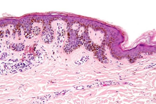 Ключевым методом лабораторной диагностики диспластических меланоцитарных невусов является гистологическое исследование биопсийного материала кожи. Диагноз устанавливается на основании выявления сочетания архитектурной и цитологической атипии меланоцитов. Архитектурная атипия отражает нарушение типичного строения меланоцитарного невуса и включает асимметрию образования, латеральное распространение пограничного компонента за пределы дермальных гнёзд меланоцитов, слияние соседних эпидермальных гребней, нарушение их регулярности и формы, а также наличие субэпидермальной фиброплазии. Фиброплазия может иметь концентрический характер с формированием гиалинизированного коллагена вокруг эпидермальных гребней либо пластинчатый характер с горизонтальным расположением коллагеновых волокон у их оснований[3]. Часто выявляется очаговый или полосовидный лимфоцитарный инфильтрат в поверхностных отделах дермы[7][9].
