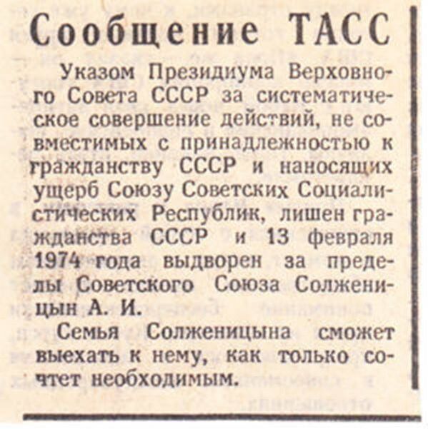 Показательна деятельность КГБ в преследовании советского писателя, лауреата Нобелевской премии по литературе А. И. Солженицына. В конце 1960-х — начале 1970-х годов в КГБ было создано специальное подразделение — 9-й отдел Пятого управления КГБ — занимавшееся исключительно оперативной разработкой писателя-диссидента[23]. В августе 1971 года КГБ предпринял попытку физического устранения Солженицына — во время поездки в Новочеркасск ему скрытно был сделан укол неизвестного ядовитого вещества; писатель выжил, но после этого долго и тяжело болел[23]. Летом 1973 года сотрудники КГБ задержали одну из помощниц писателя Е. Воронянскую и в ходе допроса вынудили её выдать местонахождение одного экземпляра рукописи произведения Солженицына «Архипелаг ГУЛАГ». Вернувшись домой, женщина повесилась. Узнав о случившемся, Солженицын распорядился начать публикацию «Архипелага» на Западе. В советской печати была развёрнута мощная пропагандистская кампания, обвинявшая писателя в клевете на советский государственный и общественный строй. Попытки КГБ через бывшую жену Солженицына уговорить писателя отказаться от публикации «Архипелага» за границей в обмен на обещание помощи в официальном опубликовании в СССР его повести «Раковый корпус» не увенчались успехом и первый том произведения был опубликован в Париже в декабре 1973 года. В январе 1974 года Солженицын был арестован, обвинён в измене Родине, лишён советского гражданства и выдворен за пределы СССР. Инициатором депортации писателя был Андропов, чьё мнение стало решающим при выборе меры «пресечения антисоветской деятельности» Солженицына на заседании Политбюро ЦК КПСС[24]. После высылки писателя из страны, КГБ и лично Андропов продолжили кампанию дискредитации Солженицына и, как выразился Андропов, «разоблачения активного использования реакционными кругами Запада подобных отщепенцев в идеологической диверсии против стран социалистического содружества».