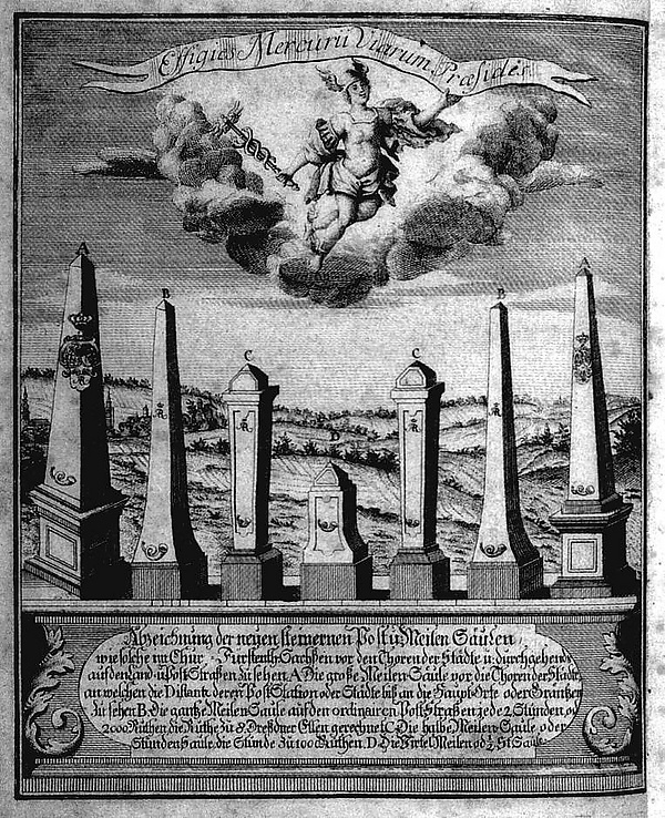 Первые современные дистанционные столбы были установлены в Саксонии (ныне Германия) в 1695 году. С 1721 года там под руководством Адама Фридриха Цюрнера проводились землемерные работы и возводились столбы из камня. По почтовым трактам были сооружены ¼-мильные, ½-мильные, 1-мильные столбы и дистанционные столбы в форме обелисков. Первой дорогой, на которой были установлены такие дорожные знаки, стал почтовый тракт Дрезден — Лейпциг[1].