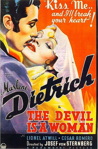 Тридцатые годы проходили для актрисы чередой романов, из-за которых она часто путешествовала. На родине её фильмы были запрещены к показам, так как она не соответствовала образу правильной арийской женщины. Отношения со Штернбергом все ухудшались из-за его ревности, но он оставался непререкаемым авторитетом для Дитрих. Напоследок Марлен снялась в его картине «Дьявол — это женщина». Гениальная игра со светом сделала фильм уникальным, но критики его посчитали скучным. Расстроенный Штернберг уничтожил все копии фильма (кроме одной, показанной на Венецианском кинофестивале в 1959 г.) и уволился из «Парамаунт», уйдя в небытие.[10]