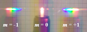 А вот положения максимумов порядка определяются длиной волны. Чем меньше , тем меньше угол для данного . Поэтому в максимуме -го порядка монохроматические волны разделяются в пространстве: самой близкой к к центральному максимуму окажется фиолетовая полоса, самой далёкой — красная. Таким образом, в каждом порядке свет раскладывается решёткой в спектр.