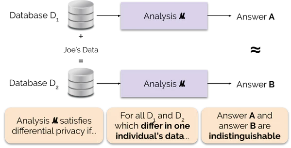 Определение относится к механизму публикации, а не данным как таковым. Для любых двух похожих наборов данных дифференциально приватный алгоритм ведёт себя почти одинаково. Это гарантирует — присутствие или отсутствие одной личности не оказывает существенного влияния на итоговый результат.