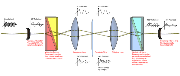Призма накладывает два ярких поля одно на другое и выравнивает их поляризацию так, чтобы два луча интерферировали. Из-за различной степени освещения изображения не перекрывают друг друга полностью, то есть вместо того, чтобы интерферировать с лучом, проходящим через ту же точку, первый луч будет интерферировать с лучом, проходящим через соседнюю точку и имеющим другую фазу. Так как различие оптических путей порождает различие фаз, комбинация лучей является «оптическим дифференцированием» и приводит к возникновению видимого изображения.