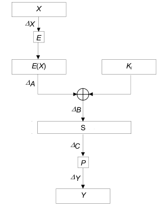 На схеме изображена функция Фейстеля . Пусть и — пара входов, различающихся на . Соответствующие им выходы известны и равны и , разница между ними — . Также известны перестановка с расширением и -блок, поэтому известны и . и неизвестны, но мы знаем, что их разность равна , так как различия c и нейтрализуются. Единственные нелинейные элементы в схеме — это -блоки. Для каждого -блока можно хранить таблицу, строки которой — разности на входе -блока, столбцы — разности на выходе, а на пересечении — число пар, имеющих данные входную и выходную разности, и где-то хранить сами эти пары.