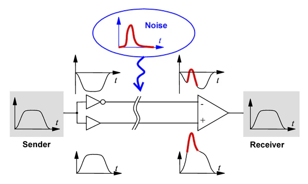 При условии, что импеданс источника и приёмника в дифференциальной цепи равен, внешние электромагнитные помехи, как правило, будут затрагивать оба проводника одинаково. Так как приёмная схема определяет разницу уровней между проводами, дифференциальные сигналы становятся более устойчивы к воздействию электромагнитных помех по сравнению с одиночными проводниками, уровень которых измеряется относительно земли. Метод передачи дифференциальных сигналов используется как для аналоговых сигналов (например, в сбалансированных аудиоподключениях), так и для цифровых сигналов, особенно высокоскоростных: RS-422, RS-485, Ethernet по витой паре, PCI Express, DisplayPort, HDMI и USB. Один из стандартов передачи дифференциальных сигналов — LVDS (TIA/EIA-644)[2].