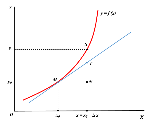 Уравнение касательной к графику функции в точке имеет вид . Если положить , то . Правая часть есть значение дифференциала функции в точке , отвечающее рассматриваемому значению . Таким образом, дифференциал совпадает с соответствующим приращением ординаты касательной к кривой (см. отрезок на рисунке ниже). При этом , то есть значение совпадает с длиной отрезка [8].