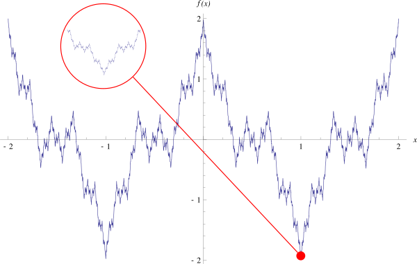 Из графиков элементарных функций можно сделать вывод, что произвольная функция дифференцируема всюду, за исключением некоторых отдельных значений аргумента. Первая попытка аналитического доказательства этого утверждения принадлежит Амперу[4], и поэтому оно носит название гипотезы Ампера. Это утверждение, однако, неверно в классе аналитически представимых функций, например, функция Дирихле не является даже непрерывной ни в одной точке[5]. Нельзя также считать и произвольную непрерывную функцию дифференцируемой, например, функция Вейерштрасса определена и непрерывна на всей вещественной оси, но не является дифференцируемой ни в одной её точке[6]. Это в частности означает, что к её графику ни в одной точке нельзя провести касательную прямую. Тем не менее, гипотезу Ампера можно рассматривать как нестрогую формулировку следующей теоремы Лебега: любая монотонная функция имеет определённую конечную производную всюду, кроме, быть может, некоторого множества значений меры нуль[7].