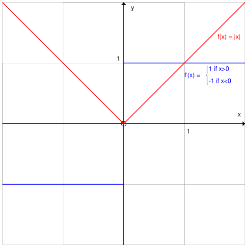 Однако эти случаи не исчерпывают всех ситуаций, когда функция недифференцируема. Так например, функция не относится ни к одному из этих случаев, но тем не менее недифференцируема в нуле.