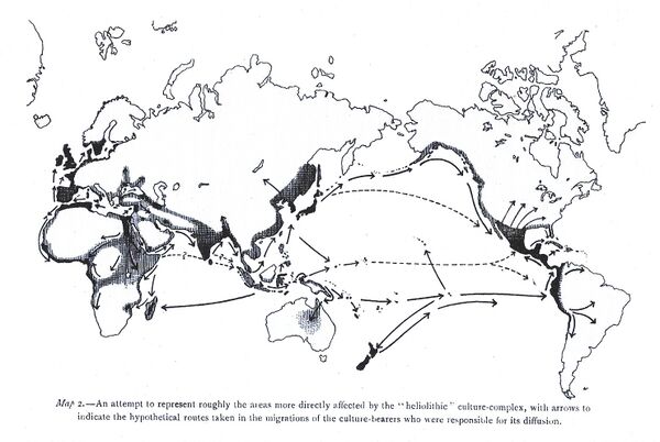 Завершённую форму диффузионизм в Англии приобрёл в трудах Графтона Эллиота Смита, известное как «панегиптизм». Учёный, исследуя культуру Древнего Египта, обратил внимание на сходство ряда черт древнеегипетской культуры (например, техника мумифицирования) с культурой других народов, в том числе расположенных в других частях света. Смит пришёл к выводу о том, что совокупность явлений культуры, зародившаяся в Древнем Египте, около IX—VIII вв. до н. э. начала распространяться по всему миру, прежде всего в восточном направлении: через Аравию и Персидский залив, Индию и Цейлон — в Индонезию, затем далее на восток — в Океанию. Из Океании и через северную часть Тихого океана элементы первичной культуры попали в Америку.