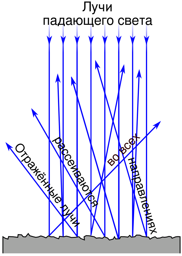 Диффузным отражение становится в том случае, если неровности поверхности имеют порядок длины волны (или превышают её) и расположены беспорядочно[2]. Критерием неровности поверхности по отражению является критерий Рэлея: