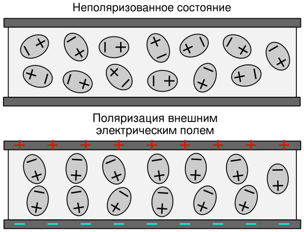 При помещении диэлектрика в электрическое поле его молекулы поляризуются: положительные и отрицательные заряды смещаются в противоположные стороны, создавая дополнительные электрические поля. Это описывается вектором поляризации , который связан с напряжённостью поля: