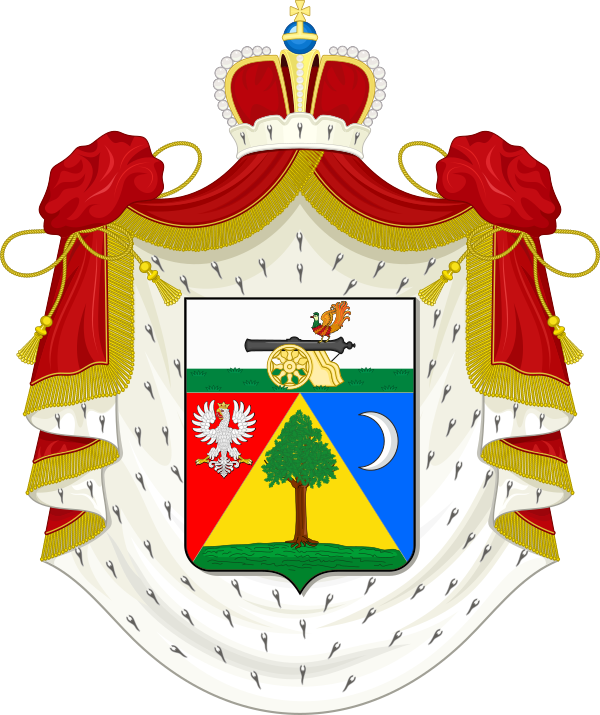 Щит разделённый горизонтально на две части имеет верхнюю малую, а нижнюю пространную, из коих в верхней в серебряном поле изображена пушка на золотом лафете с райской птицей. В нижней части, диагонально разделённой на три поля: красное, золотое и голубое, из коих на среднем, означенном наподобие возвышенной пирамиды находится дерево натурального цвета, а на крайних полях изображены белый одноглавый орёл коронованный и серебряная луна, обращённая в правую сторону.