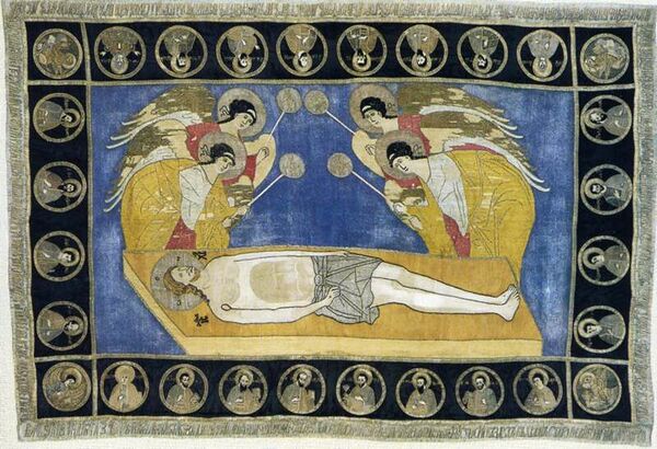 По мнению В. Л. Янина, 2 апреля 1444 года Дмитрий Юрьевич прибыл в Новгород, в том же году[26] сделав вклад в Юрьев монастырь — возду́х (плащаницу) с изображением Христа во гробе, оплакиваемого четырьмя ангелами, шитый шелками, серебряной и золотой нитью[22]:193, 197-199, 202, 203. В шитой надписи на Шемякиной плащанице Дмитрий Юрьевич именутся «великим князем». Согласно В. Л. Янину, Шемяка получил в 1444 г. в Новгороде временное убежище, а надпись была вышита позднее (в 1446—1456 гг.). Согласно А. Г. Боброву, Дмитрий Юрьевич не нуждался в 1444 г. в убежище, и, вероятно, посетил Великий Новогрод в качестве одного из двух великих князей-соправителей Руси[6]:522, 523.