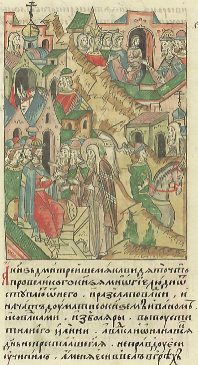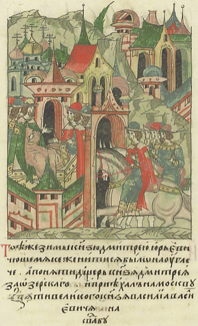 Дмитрий Юрьевич совместно с Александром Чарторыйским выступил (видимо, из Углича по Волге на Дмитров) против Василия II, они «пришли мало не к Москве», и под Троицким монастырём их примирил с Василием «игумен Зиновеи Троецкои и любовь межи их сотвори»[1]:95[22]:198. Московские летописные своды 1470-х годов ничего не сообщали о войне с Дмитрием Шемякой 1441—1442 годов, которую начал Василий II по своей инициативе[1]:243.