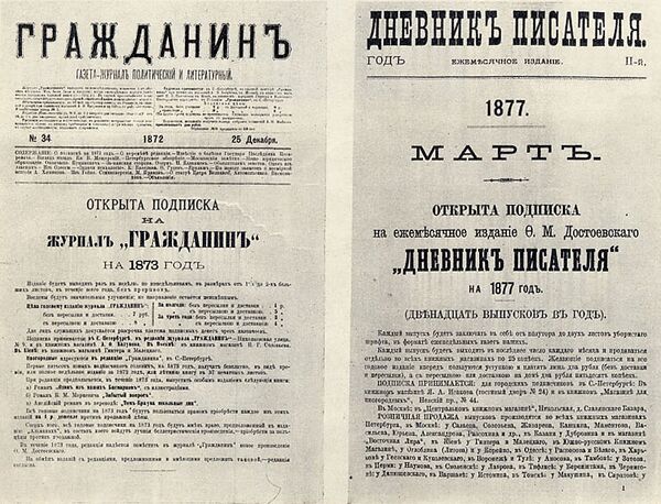 - 1873 — Достоевский Ф. М. Дневник писателя за 1873 год // Гражданин. Газета-журнал политический и литературный. — СПб.: Тип. А. Траншеля, 1873.[26]