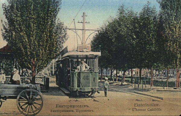Трамвайное движение в Екатеринославе было открыто 26 июня 1897 года шестью моторными вагонами немецкого производства MAN по маршруту колеёй 1000 мм и протяжённостью 6,1 км № 1 «Вокзал — Соборная пл. — Лагеря (сейчас — ул. Чернышевского)» по Екатерининскому просп. (сейчас — просп. Дмитрия Яворницкого) и Лагерной ул. (сейчас — просп. Гагарина). Тогда же на Озёрной пл. (сейчас — рынок «Озёрка») построено депо на 48 вагонов.