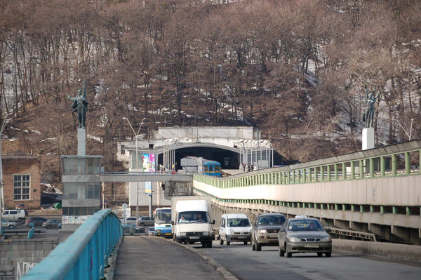Продолжением эстакады служит мост Метро арочной конструкции, совмещенный с автотранспортным мостом, построенный в 1965 году. Станция вместе с мостом Метро создает единый архитектурный ансамбль.