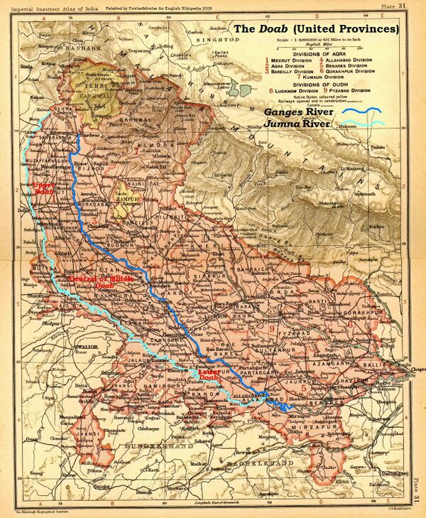 Если слово Доаб употребляется без названия каких-либо рек, то оно означает плоский аллювиальный участок земли, расположенный между Гангой и Ямуной на западе и юго-западе индийского штата Уттар-Прадеш, который простирается от Сивалика до слияние двух рек в Аллахабаде. Его площадь составляет 60,500 квадратных километров; примерно 805 км в длину и 97 в ширину.