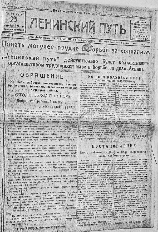 22 октября 1931 г. президиум Добринского райисполкома принял решение "О выпуске районной газеты — органа райкома КВП(б), райисполкома и райсовпрофа под названием «Ленинский путь». Тираж при населении 71 тысяча человек (без учёта позднее присоединённых Талицкого и большей части Хворостянского районов) составлял 3000 экз. Периодичность 2 номера в декаду объёмом 2 полосы (страницы).