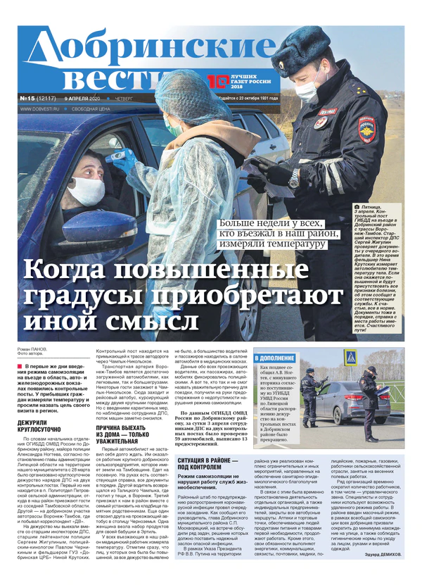В 2020 году дизайн газеты «Добринские вести» признали лучшим в России по итогам профессионального творческого конкурса Форума современной журналистики «Вся Россия-2020»[3].