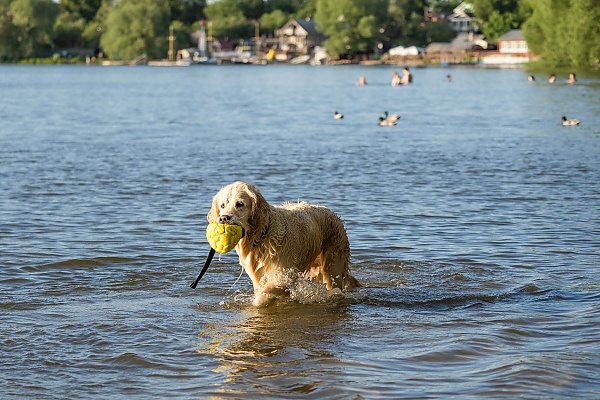 - прыжок в воду с захватом: для выполнения этого элемента на специальной установке над водой подвешивается игрушка, высота размещения которой зависит от размеров собаки. Игрушка в этом упражнении должна быть схвачена непосредственно во время прыжка;