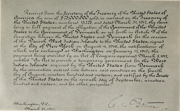 31 марта 1917 года датский министр Константин Брюн получил ордер на 25 000 000 долларов от госсекретаря Роберта Лансинга. 1 апреля состоялась формальная процедура передачи островов Соединённым Штатам Америки, за 5 дней до вступления США в Первую мировую. 250-летняя история датских колоний на Карибах завершилась[15].