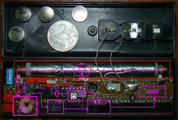 При попадании в пространство датчика ионизирующего излучения, под его воздействием возникает вынужденная ионизация (появление свободных носителей заряда) и в заряженном электрическом поле по треку возникает лавинный пробой, ориентированный в направлении «катод-анод» электростатическим полем, под воздействием которого попадают эти свободные носители заряда и привлечённые цепной ионизацией носители заряда зоны пролёта. А поскольку собственная ёмкость (Cгаш) датчика минимальна, при правильно подобранном сопротивлении Rн происходит полный разряд электростатического потенциала датчика, по истощении которого пробой затухает, полностью сбрасывая потенциал до нижнего края плато. Таким образом датчик на время пробоя переходит в замкнутое состояние, чем формирует импульс, пропускаемый конденсатором Cэ, который при этом тоже разряжается, благодаря чему импульс, соответствующий частице или гамма-кванту количественно, поступает на вход аттенюатора, а у датчика при этом наступает мёртвое время измерения (время перезаряда пространственного конденсатора до нижнего края плато, в которое он не способен регистрировать излучение).