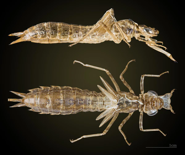 Грудь зелёная, с широкими чёрными полосами на швах. Крылья прозрачные, длиной 5 см. Крыловая пластинка контрастной серо-белой окраски. Ноги с длинными шипами, из которых в полёте складывается «корзиночка» для ловли насекомых. Брюшко у взрослого самца голубое, у самки зелёное или голубовато-зелёное, со сплошной чёрной зазубренной продольной полосой на спинной стороне. Глаза крупные, сине-зелёной окраски.