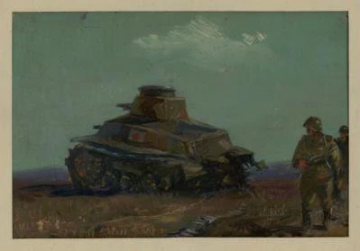 В центре композиции изображён разбитый японский танк с отвалившимися гусеницами. Справа изображены солдаты в полном обмундировании с оружием. На оборотной стороне полотна, в верхнем правом углу, карандашом выполнена надпись «Титов Я. В. / „докатился“, (японский / танк)».