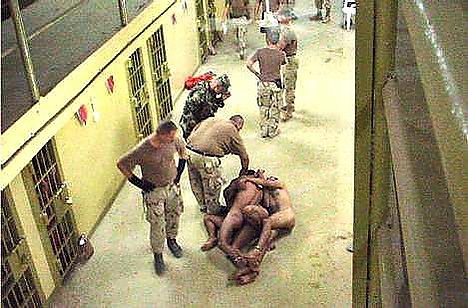 - прикрепляли цепь для собаки к ошейнику на шее обнаженного заключенного, женщина-охранник держала его при этом за цепь и позировала для фотографии;