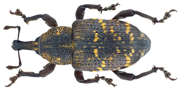 Крупный жук длиной 7—14 мм, тёмно-бурый, с редкими желтоватыми волосками и чешуйками, усеян мелкими точками, ямочками. Хоботок довольно длинный, круглый, слегка согнутый, близ конца его прикрепляются усики. Бороздка для них загибается к нижнему краю глаза, на вершинах голеней по одному крупному зубцу в виде крючка. На бёдрах, около середины, также по одному крупному зубцу. Щитик волосистый, на элитрах крупные продольные пунктиры с морщинистыми промежутками. Жёлтые чешуйки-волосики образуют на элитрах две прерывающиеся перевязки и отдельные небольшие пятнышки.