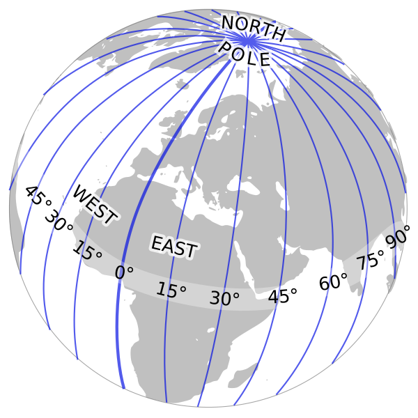 Долгота указывается как угловая величина в диапазоне от 0° (значение на нулевом меридиане) до +180° на востоке и −180° на западе. Греческая буква λ (лямбда)[7][8], используется для обозначения местоположения места на Земле к востоку или западу от нулевого меридиана.