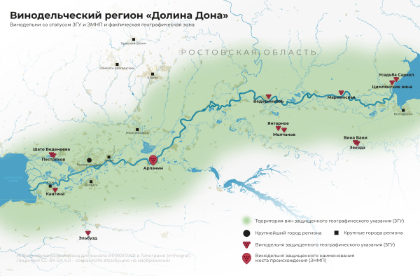 31 декабря 2014 года Федеральным Законом № 490 была введена классификация, делившая все российские вина на три группы — столовые вина, вина защищенного географического указания с обозначением региона производства и вина защищенного наименования места происхождения, обладающие некоторыми уникальными признаками, полученными на конкретной местности[10]. В России были созданы так называемые винные кластеры. В Ростовской области был выделен регион низовьев реки Дон, который позже стал винодельческим регионом Долина Дона[11][12].