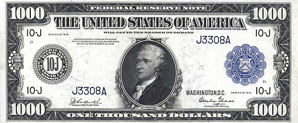 - Первый министр финансов Александр Гамильтон (англ. Alexander Hamilton) — на банкноте в 1000 долларов 1918 года.